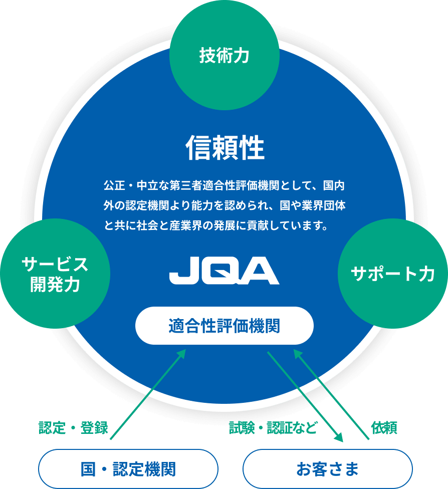 私たちは、「技術力」「サービス開発力」「サポート力」を活かして、信頼性の高い確かな適合性評価を行い、安心で豊かな社会づくりと技術の発展に貢献しています。