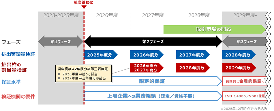 - 保証水準については、制度開始後3年間は「限定的保証」となります。2029年度以降は大規模事業所を対象として段階的に「合理的保証」へ引き上げられる方針です。