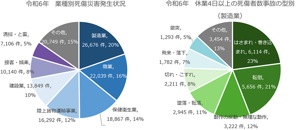 厚生労働省が発表した令和6年における労働災害の発生状況によると、死傷災害の発生件数が最も多い業種は製造業であり、全体の約20%を占めています。特に注目すべきは、製造業における休業4日以上の死傷者数事故の型別で「はさまれ・巻き込まれ」が最も多いという点です。これには、作業者が動作中の産業用ロボットのアームと壁の間にはさまれることによる事故、回転式のエンドエフェクタに巻き込まれることによる事故なども含まれていると考えられます。