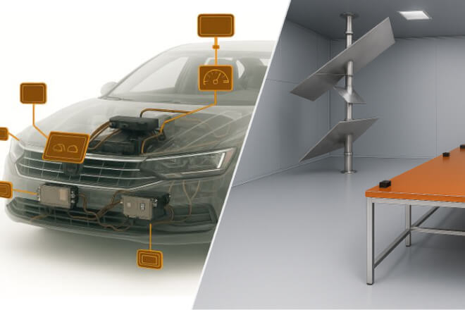国際規格、自動車メーカー規格などに対応したEMC試験および、Eマーク規制に基づく適合性評価