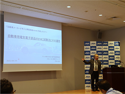 2025年9月19日(金)にトヨタ自動車株式会社様、マツダ株式会社様、株式会社SUBARU様から講師をお迎えし、「自動車メーカーが考える車載機器のEMC性能」セミナーを開催いたしました。当日は77名の方々にご参加いただきました。