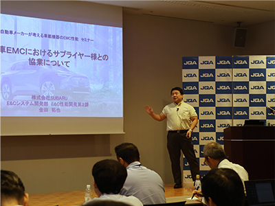 セミナーでは、トヨタ自動車株式会社 野島様より「自動車及び車載機器に関するEMC基準と規格動向」をテーマに、7月に大幅改定されたCISPR12第7版について、その詳細をご説明いただきました。続いて、マツダ株式会社 手島様より「自動車用電気電子部品のEMC試験法とその運用」をテーマに、JASO TP23002を題材に自動車メーカーが考えるEMC性能や試験品質の重要性についてお話しいただきました。最後には、株式会社SUBARU 金田様より「自動車EMCにおけるサプライヤー様との協業について」をテーマに、UN ECE R10の第7版の改正内容と、短期開発に向けたサプライヤー様との協業による開発加速についてご講演いただきました。