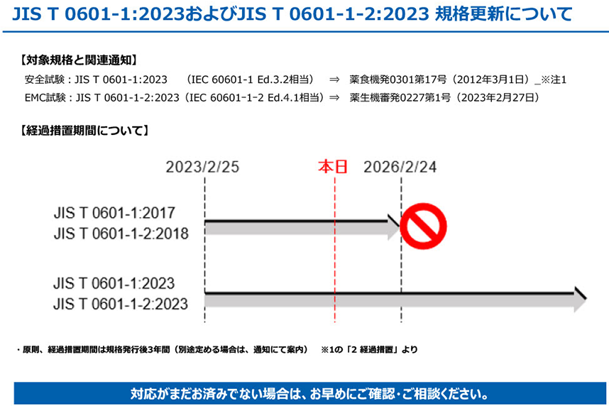 また、「平成24(2012)年3月1日 薬食機発0301第17号」に記載のとおり、JIS T 0601-1:2023への適合性確認の経過措置も同日が期限となります。